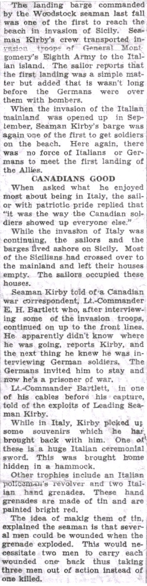 Regular visitors to this blog/archive (dedicated to the 950 - 1,000 Canadian sailors who were both members of RCNVR and Combined Operations) will know that this series of entries reveals a good number of significant news articles and photographs (and more) related to Allied actions during January and February 1944 in wide-ranging theatres of war (e.g., in Italy, Russia and the Pacific). This series also is hoping to reveal a bit of news about the contingent of sailors who returned to Canada from the Mediterranean theatre in late 1943 - after two years service overseas (at Dieppe, North Africa, Sicily and Italy), and before settling into new duties in other locations.